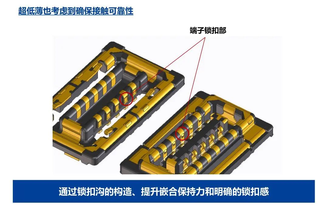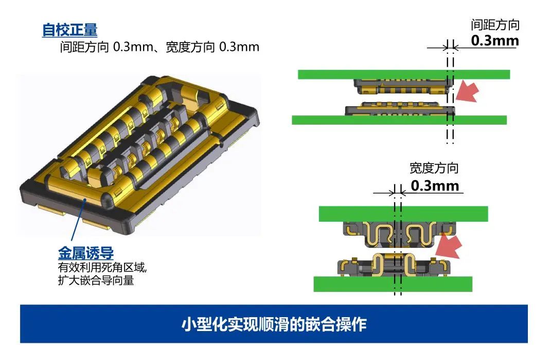 尺寸 省空間 防燥對(duì)策 RF特性(連接器單體) RF特性(連接器+FPC) 牢固構(gòu)造 端子鎖扣構(gòu)造 通過金屬誘導(dǎo)實(shí)現(xiàn)了較大的自校正量