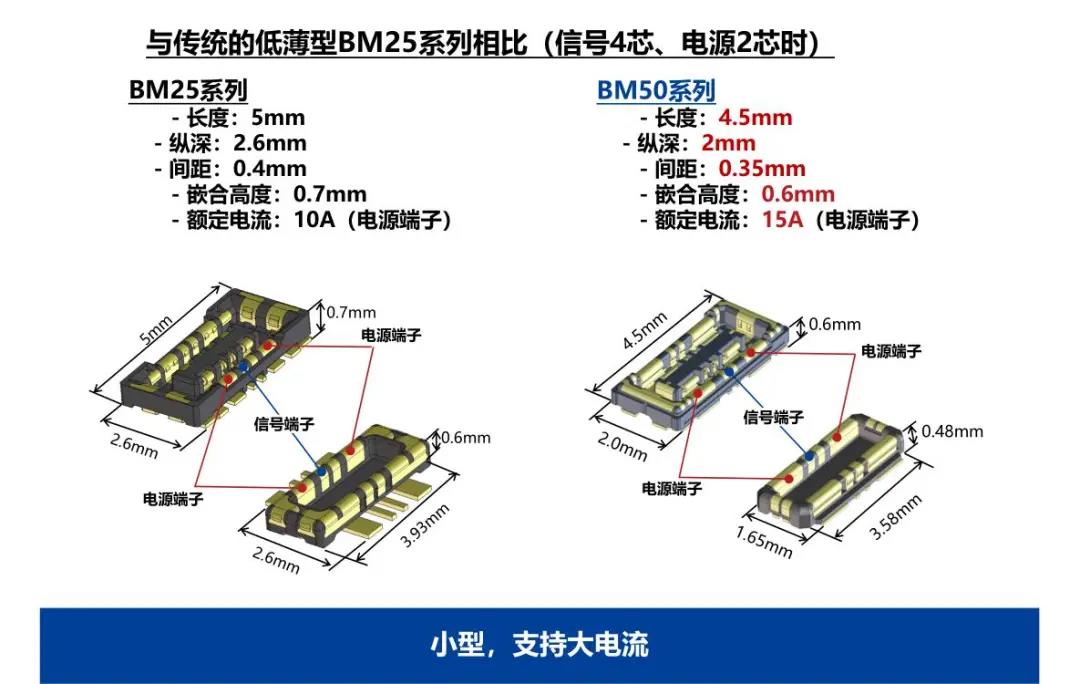 特點(diǎn) 1 兼顧供電能力和小型化的設(shè)計(jì) - 額定電流:支持電源端子15A、信號端子0.3A - 嵌合高度:0.6mm、縱深:2.0mm 2 通過全包覆構(gòu)造,確保高牢固性 3 使接觸電阻最小化,節(jié)省電力 4 實(shí)現(xiàn)小型,高抜出力 5 互相夾緊型多觸點(diǎn)構(gòu)造,確保高接觸可靠性 有助于小型化&大電流化