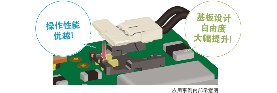垂直嵌合不影響其他元器件,有效節(jié)省空間,提高基板設(shè)計自由度。采用從上向下的嵌合方式,易于確認(rèn)嵌合口,從而更好地確定插